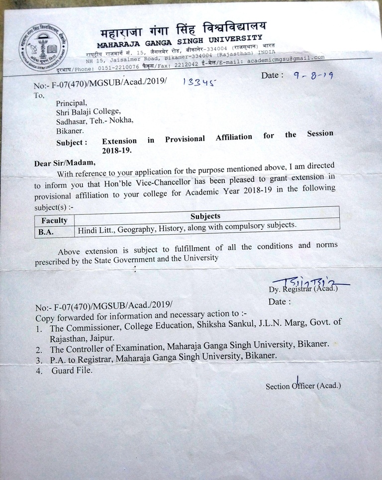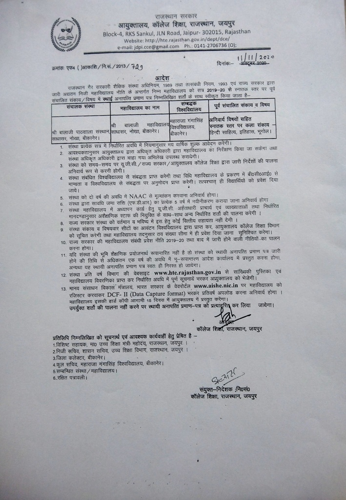 Shri Balaji College, Sadhasar, Nokha a college exclusively for girls & Boys, affiliated to the Maharaja Ganga Singh University, Bikaner set up in a sprawling lush green campus, is being run with commitment to make an indelible mark in the field of education by creating a global study center of excellence.